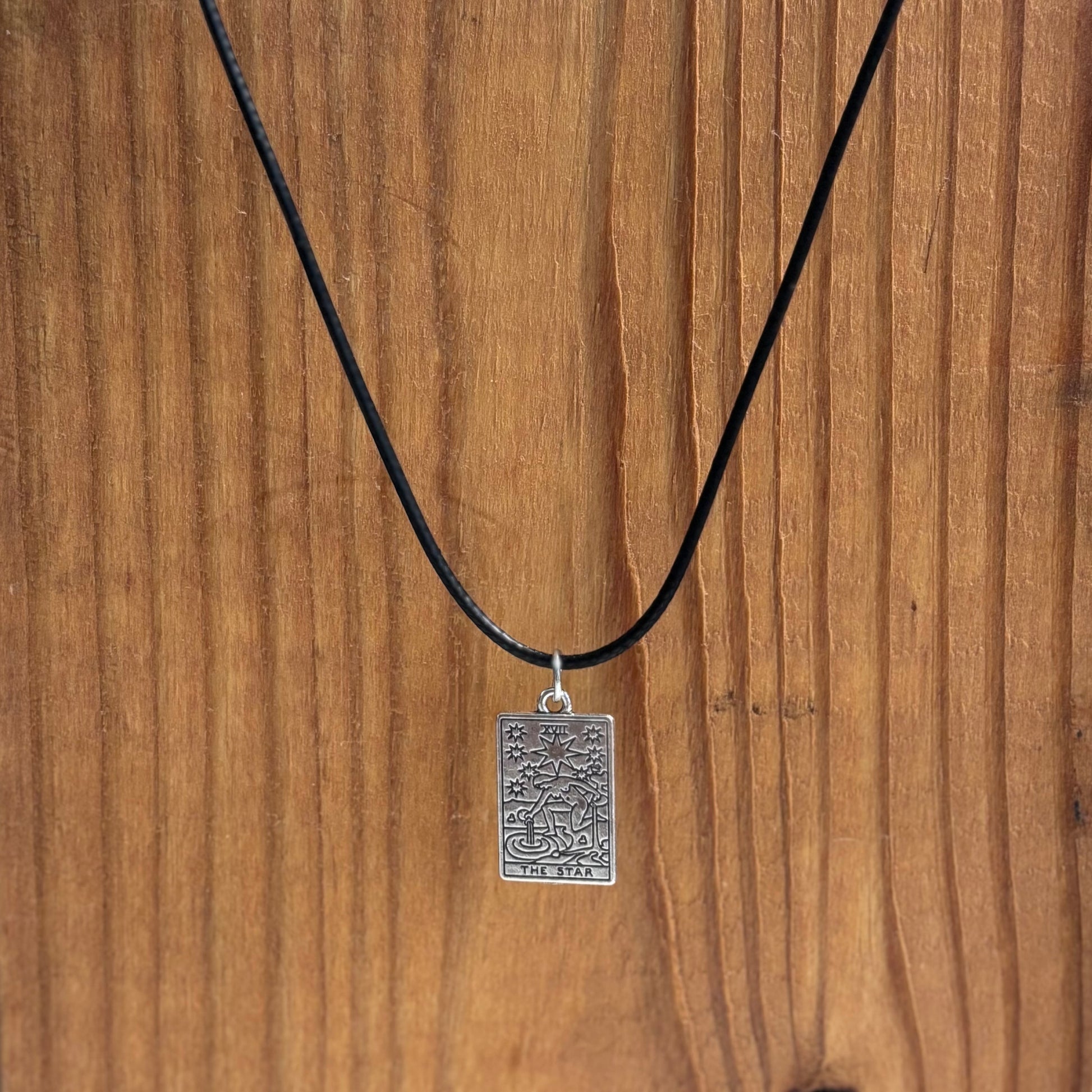 The Corded Tarot Necklace showcases a mystical handcrafted charm suspended on a sleek black cord. Take a chance and see what card you draw!